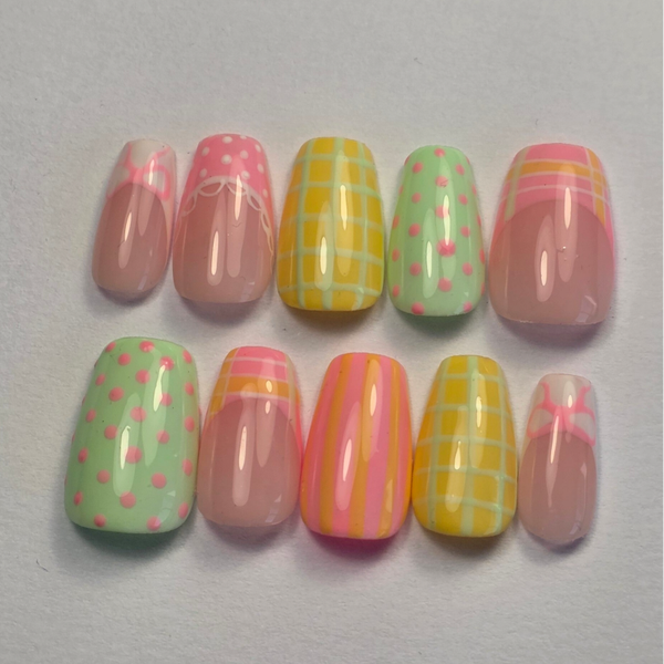 Un nail art mêlant couleurs pastels et détails graphique pour un look délicat.