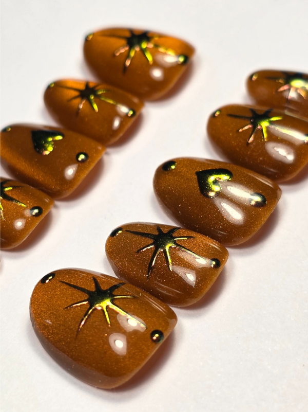 Adopte un style chromé avec ces faux-ongles alliant le brillant du cat eyes orangé et du chromé!