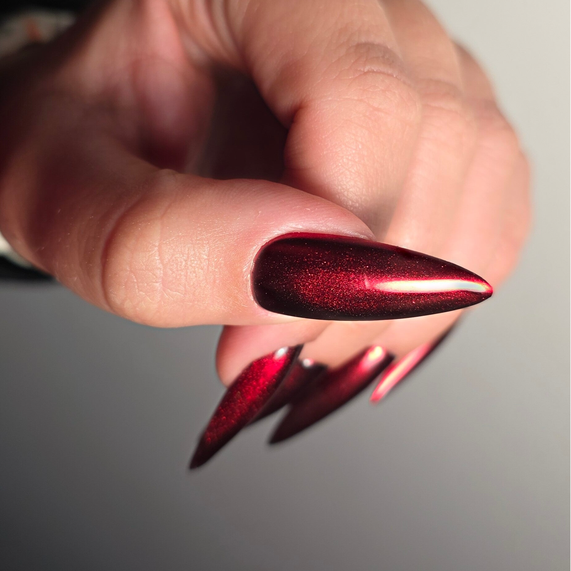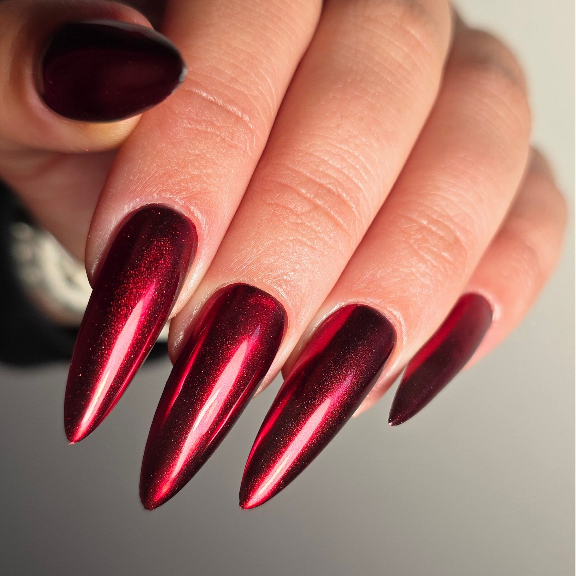 Choisis une manucure rouge métallisé pour un Noël étincellant! Ici présenté en forme Amande L et finition brillante.